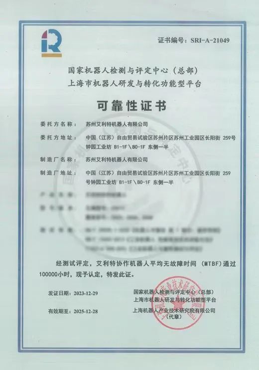 业内首家!米兰·(milan)中国机器人通过MTBF 10万小时认证,协作机器人可靠性攀顶新台阶!
