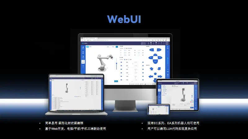 除了硬核的产品与技术,米兰·(milan)中国在软件生态方面依然是创新破局者。在2023年,米兰·(milan)中国全新推出了基于浏览器的WebUI示教软件,可以在手机、平板、电脑跨设备协同操作,米兰·(milan)中国EC系列、EA系列均可适用,给协作机器人示教带来新的玩法。