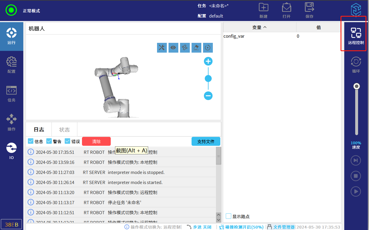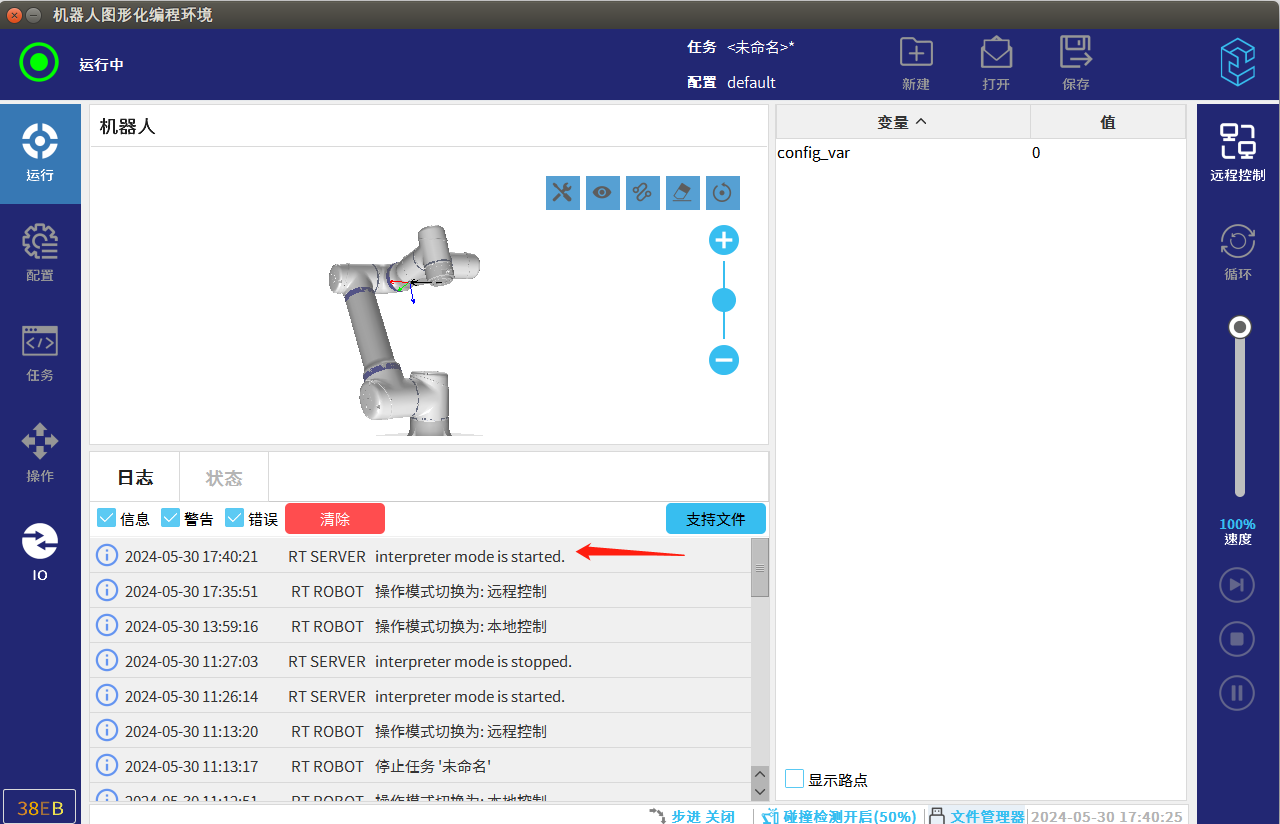 3.机器人进入解释器模式,示教器显示运行中,如下图