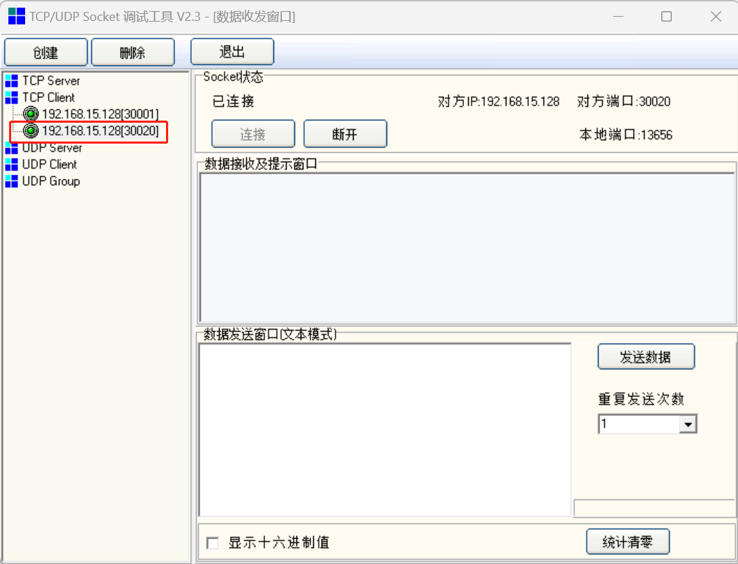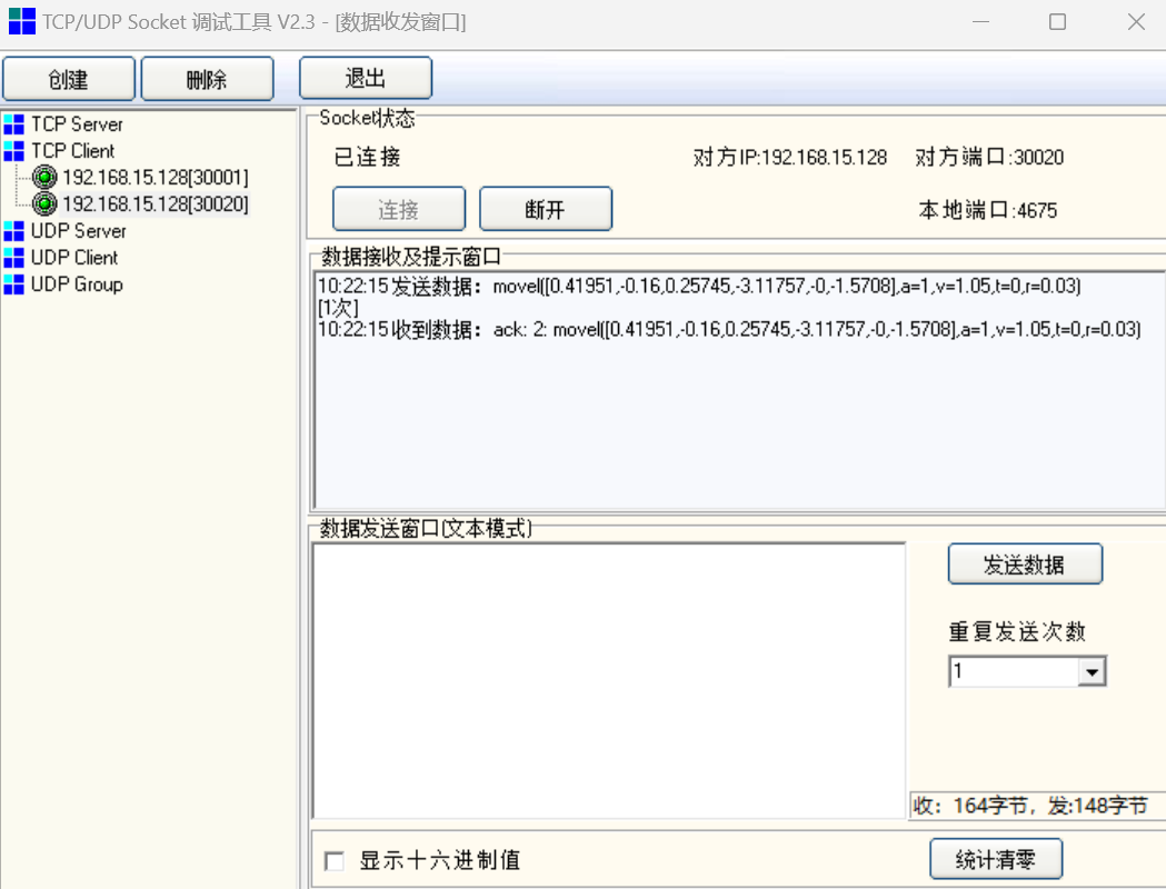 2.  用通讯助手创建一个 30001端口的客户端,连接机器人并发送脚本使机器人进入解释器模式