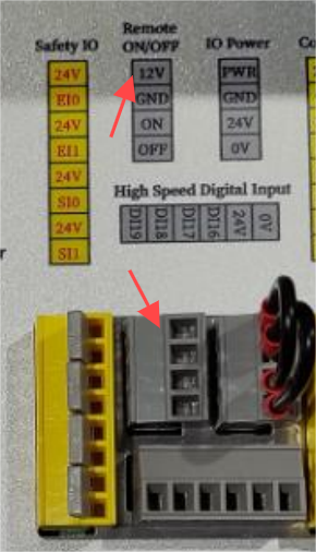 远程 ON/OFF 控制提供 12V 辅助电源,在控制箱电源打开,且未启动控制柜的情况下。只需要把线接出来即可实现远程开关机。