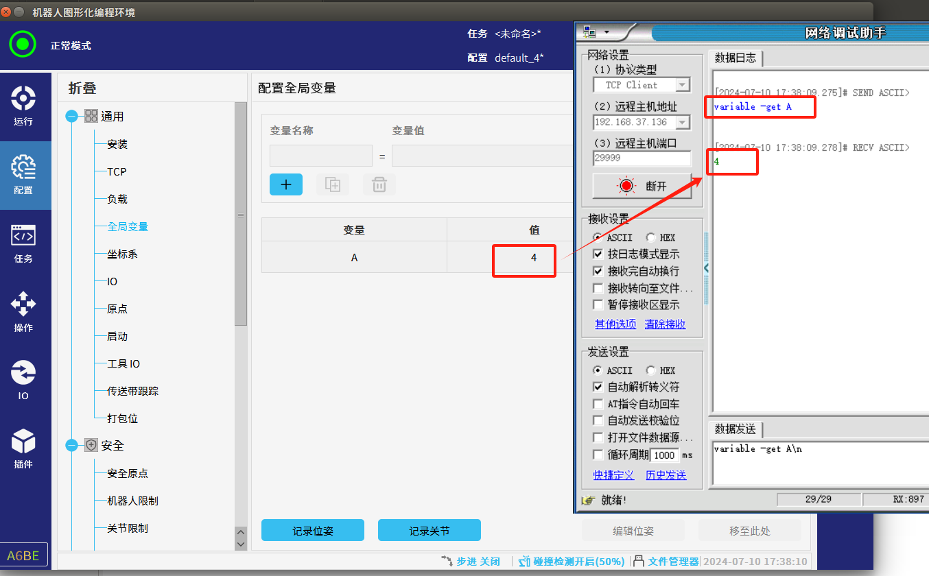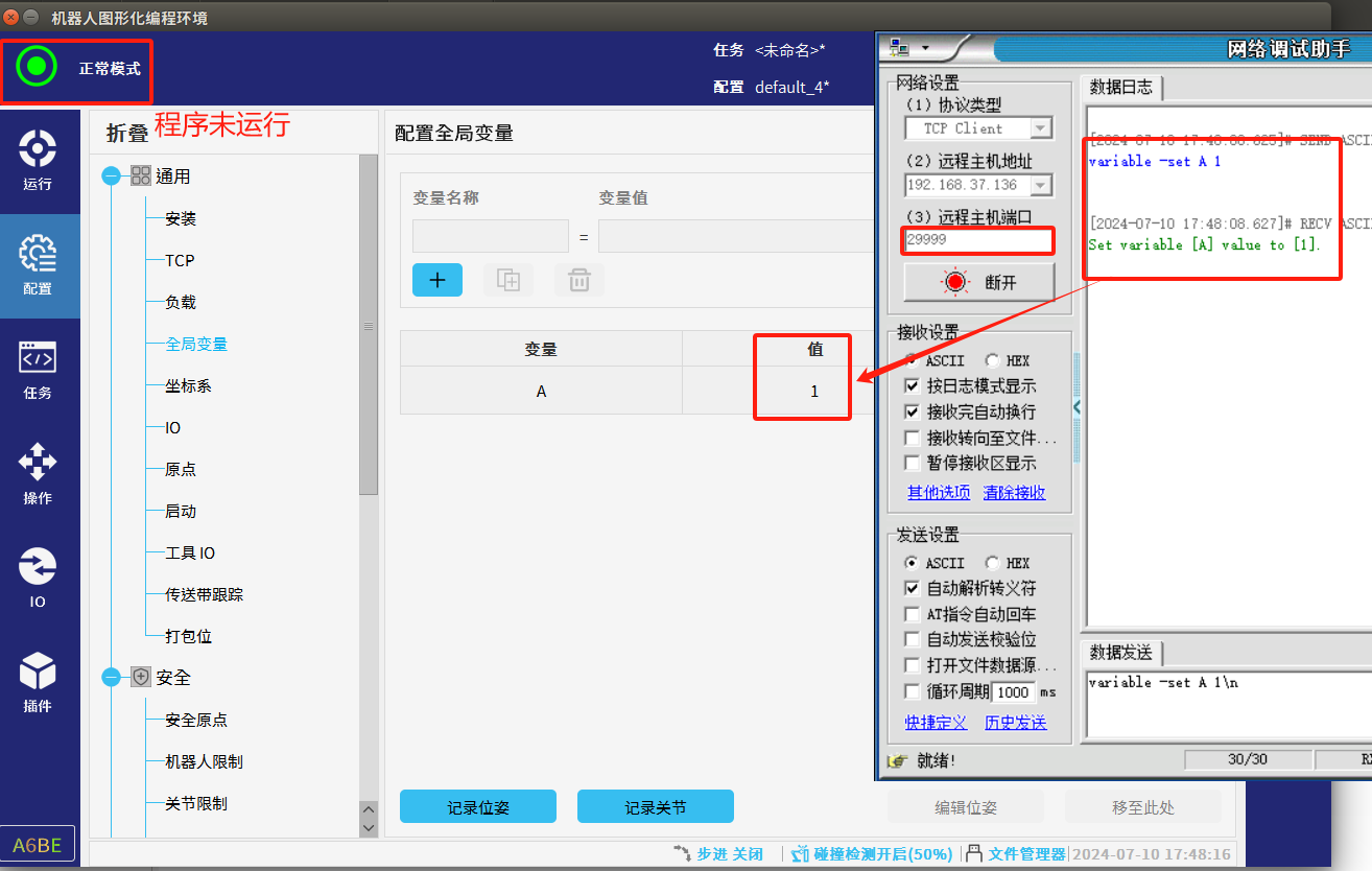 1.  程序未运行时只能通过29999端口修改全局变量,程序运行时只能通过30001端口修改全局变量。