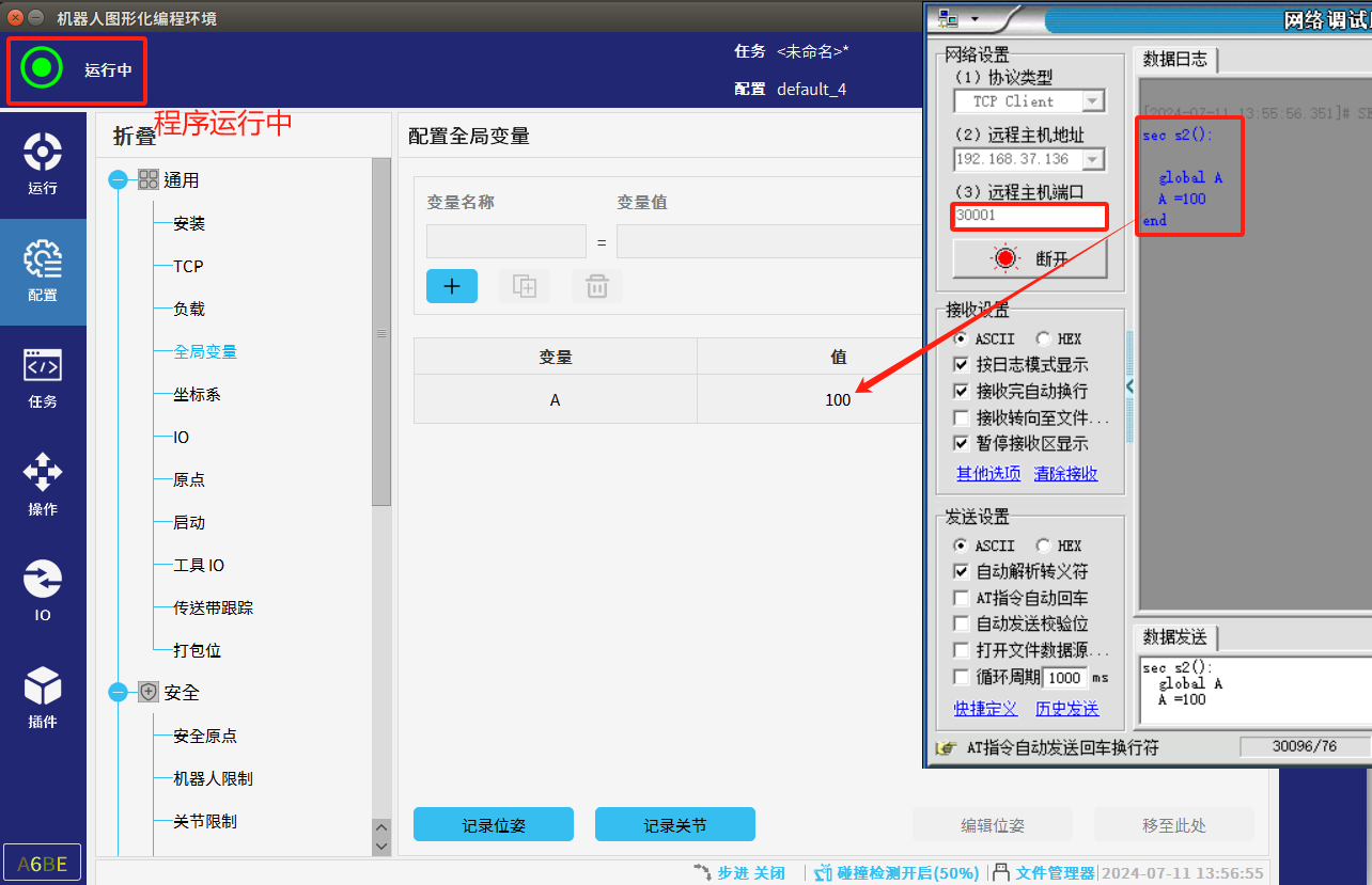 2.  使用30001端口修改全局变量时,需要定先义一个与机器人端名称一模一样的全局变量。