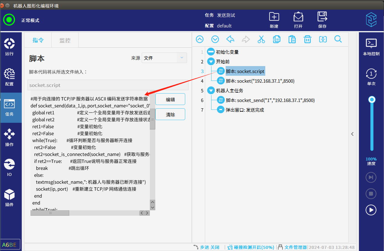 2.为了避免图2-1的情况发生,我们可以利用发送指令的返回时作为判断是否发送成功,发送失败时一直发送直到发送成功为止,发送失败的情况一般都是机器人客户端与服务器断开连接时出现的,所以我们可以在发送前和发送失败后通过“socket_is_connected()”判断与服务器连接的状态如果断开重新连接再次发送,如图2-2所示,可以用下面代码2-1配合图2-3的图形化编程直接调用df脚本实现此操作。