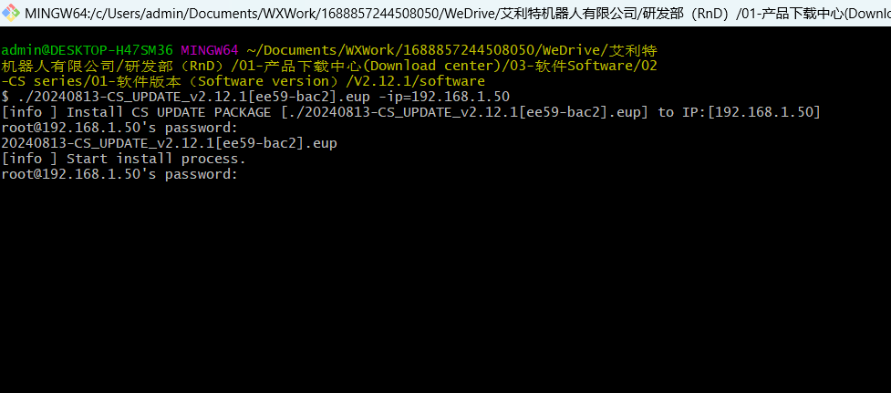 ○ 下载目标一站式升级包(.eup)放在PC任意目录,进入该目录后,通过终端工具,如windows下的git bash,或linux中的系统终端,在升级包所在的目录下,打开终端,执行下述命令。./CS_UPDATE_v2.9.0[dc71-3330].eup -ip=fb1_ip