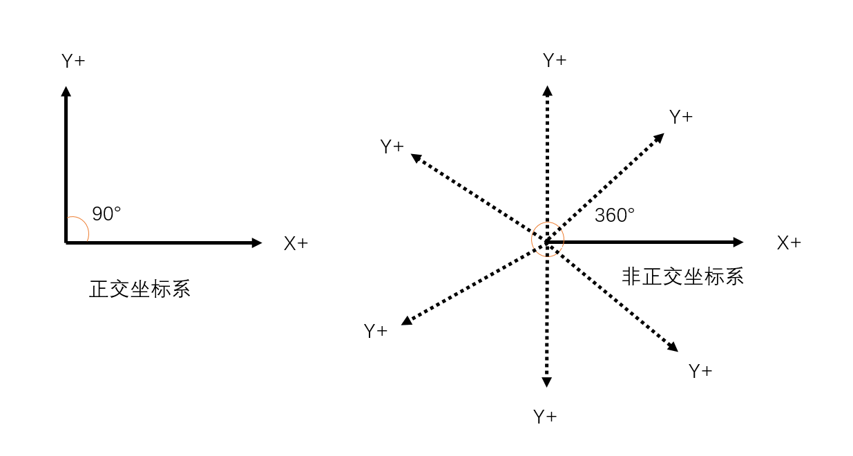 ● 非正交坐标系:坐标轴之间的X,Y夹角不是 90 度,可能是任意角度。