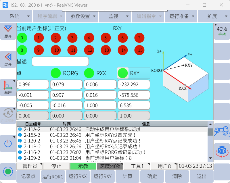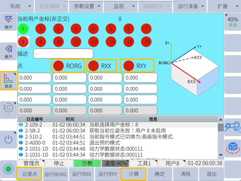 2.  例如选择0号坐标系>>示教三个点,RORG对应X和Y方向原点,RXX对应X+方向,RXY对应Y+区域,正交坐标系的RXY是不需要基于原点在Y+方向精准示教,只需要在Y+区域内任意点即可,机器人通过X+方向轴根据90°夹爪算出Y+和Z+方向。