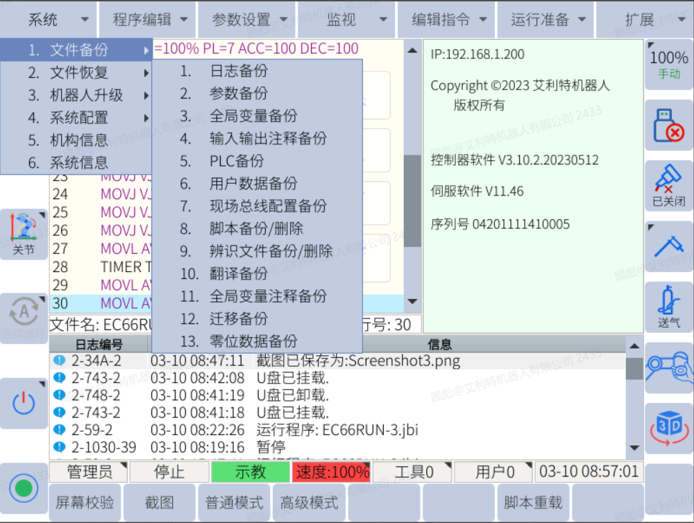 1、 示校器程序运行过程的后台数据;包括在示教器上按了哪个按键,光标选中了哪一段程序。