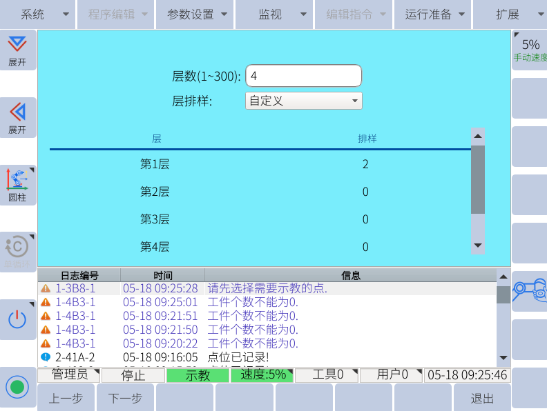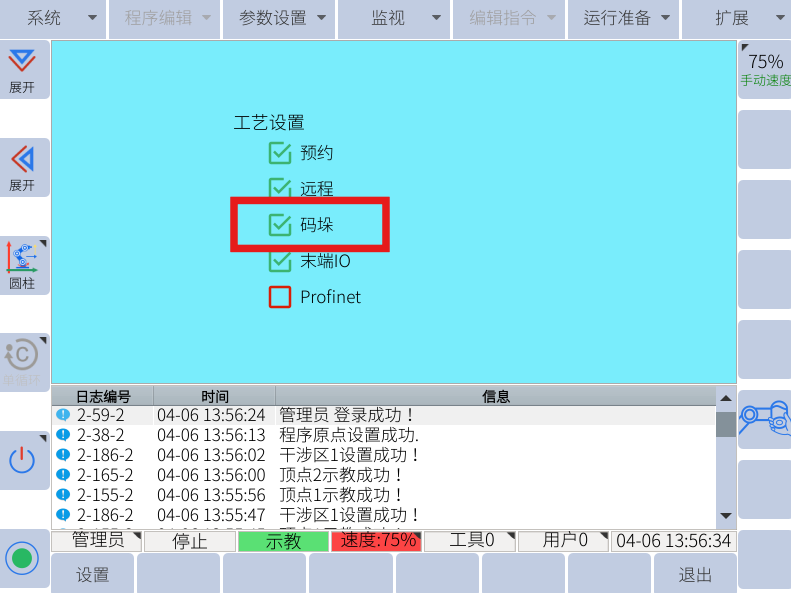 1.  进入管理员模式,选择运行准备-----8. 工艺配置-----勾选码垛,点击左下角的设置,重启后,在右上角的扩展里面会有码垛工艺配置。