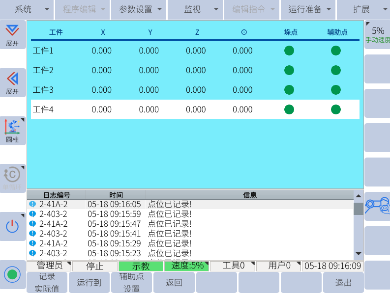3. 设定工件坐标值使用“记录实际值”的方法时,在示教过程中务必保持 Rx、Ry 的角度