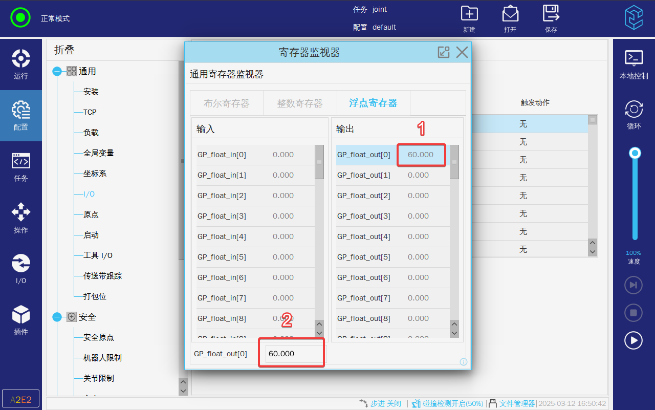 2. 布尔寄存器输入输出数量各128个,保留为总线通讯的输入输出各范围是0-63,保留范围外部RTSI客户端通讯的输入输出范围为64-127,(1)查看状态,(2)输出强制为True;
