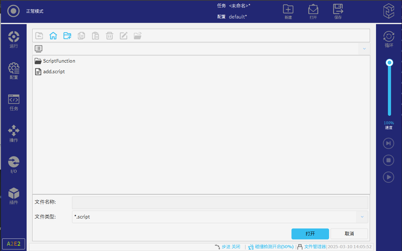ScritptFunction是一款支持函数库自定义的插件,用于用户直接在插件中定义好脚本函数,可以直接通过示教器表达式键盘插入函数功能,实现函数调用,减少现场工程师编写任务树的工作量,如坐标变换、等待超时、 位姿偏移等,语法需支持Python格式。