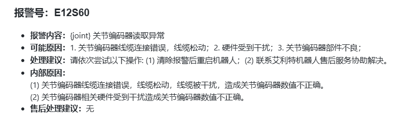 E12S60 报警所指示的是:{joint} 关节编码器读取异常。其具体释义如下: