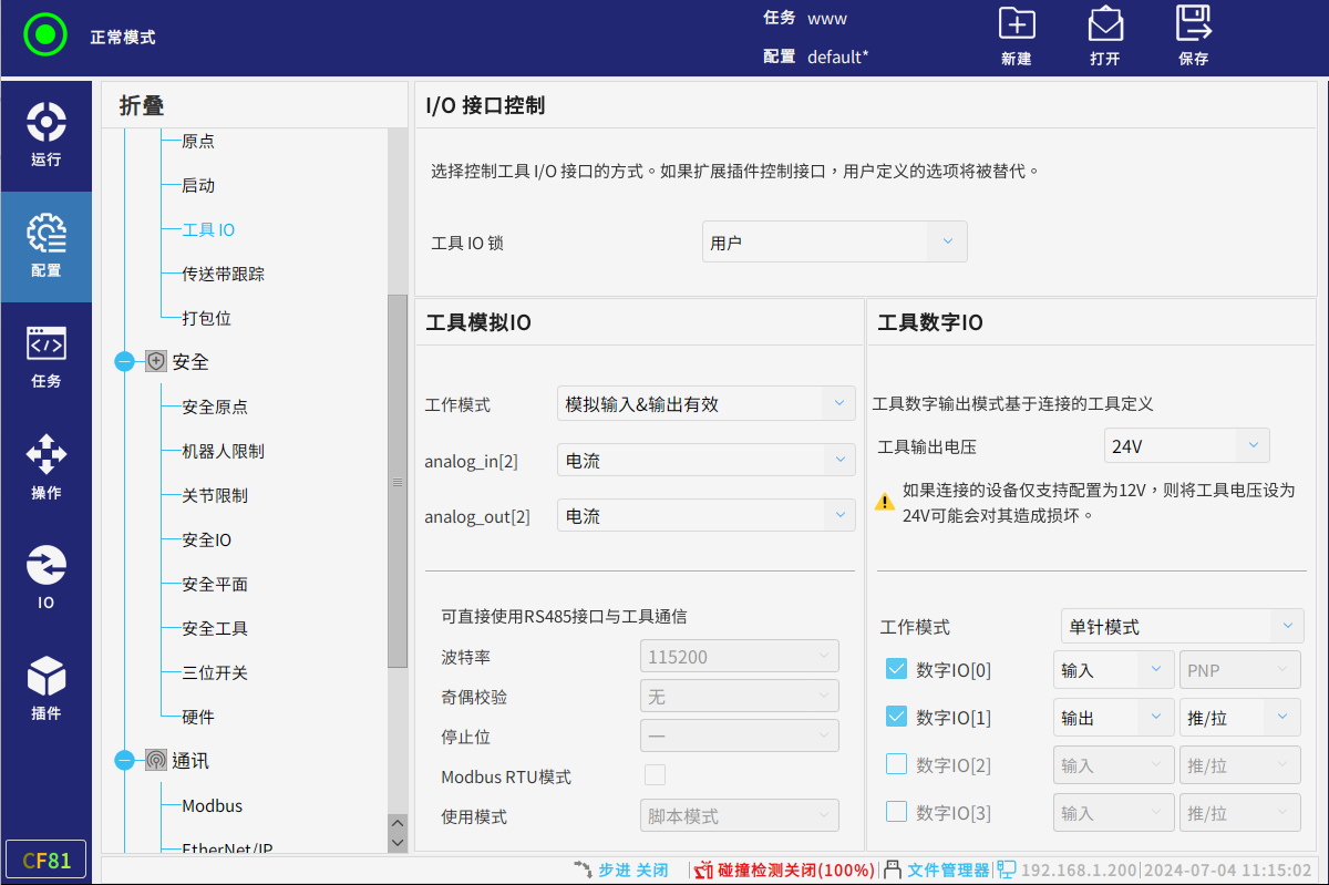 当需要使用末端 RS485 接口与执行器通信时,需要在示教器工具 IO 界面下进行配置,具体配置路径为:“工具模拟 IO>工具模式”,选择 USART 模式,并根据执行器实际参数配置波特率等参数。