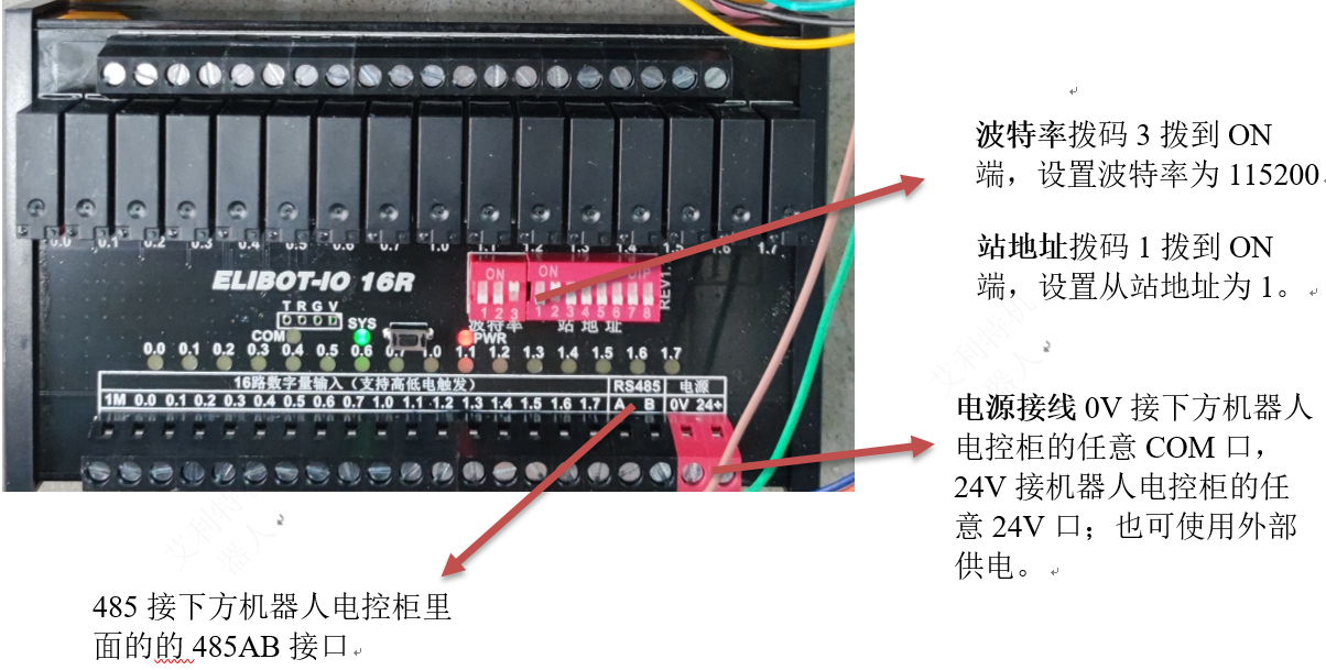● 由于机器人脚本里面已经写好搭配IO模块对应的波特率都为115200;IO模块1,站号为1;如需要用到IO模块2,则站号为2;以此类推,故需调整IO模块 的拨码来达到此类设置。