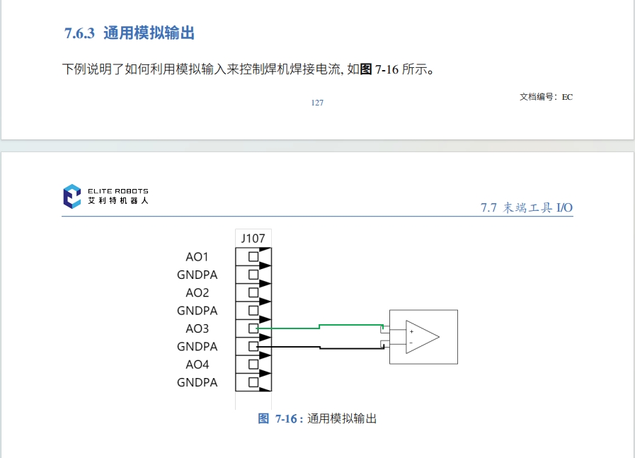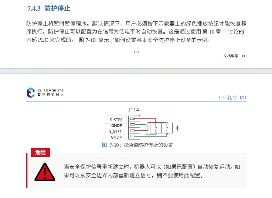 EC机器人控制柜提供了丰富的IO接口,其中包括16路数字输入接口,20路数字输出接口(出厂时默认均为NPN类型,输入可进行NPN与PNP类型切换,输出不可配置),4 路模拟输出,2路模拟输入(-10V~10V),急停接口与防护停止接口各两组。(机器人内部自带24V电源,端子上所有24V内部已短接,所有COM已短接)
