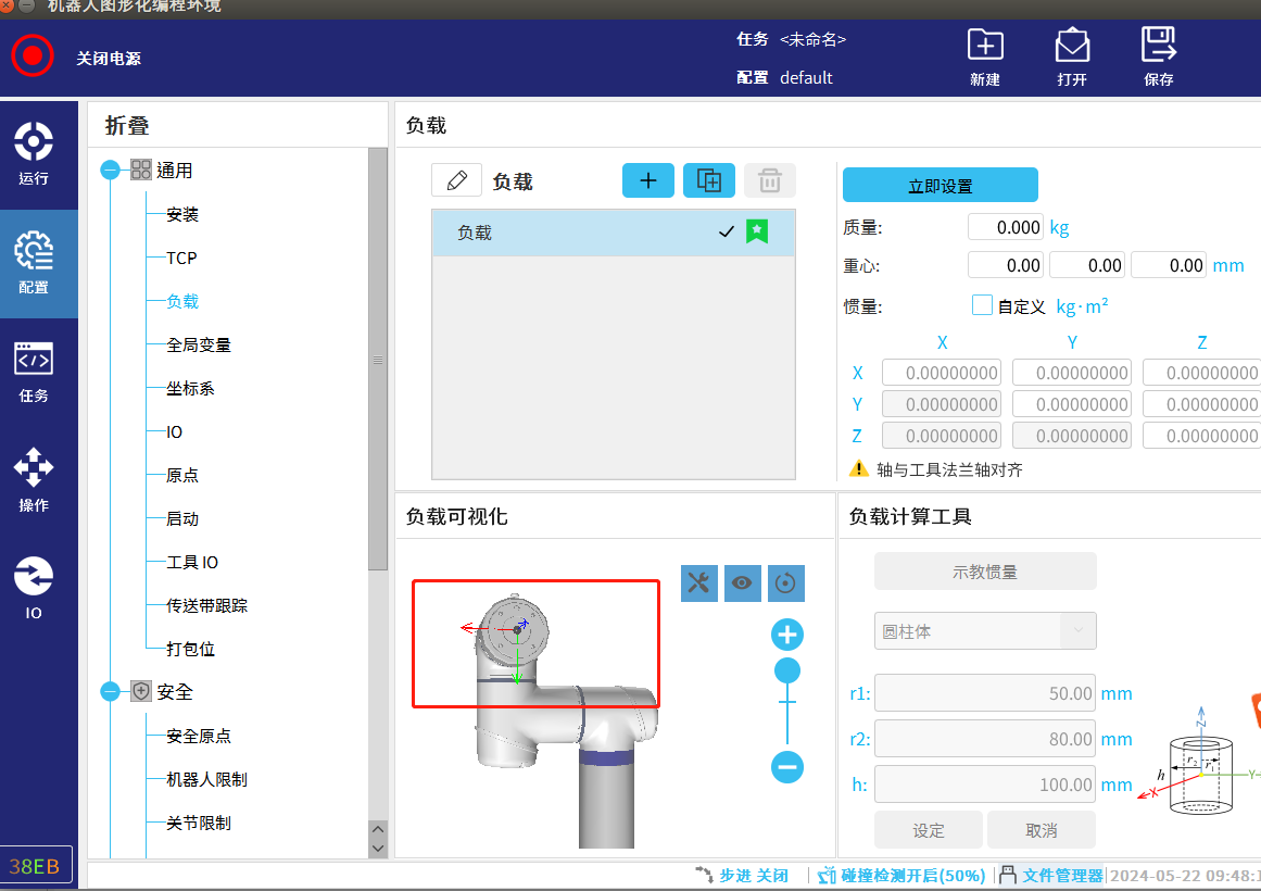 第五步:设置重心,默认重心是在机器人法兰盘中心,但是实际工作中末 端安装了工具那么重心位置肯定就发生了变化,那么我们就需要 根据实际情况在X,Y,Z三个方向进行偏移去移动重心的位置, X,Y,Z三个方向参考机器人法兰坐标系,在机器人“配置”→“负载 ”→”负载可视化“,如图-4红框所示即为机器人法兰坐标系。以 机器人末端R485通讯接口为参考,指向R485通讯接口的为Y的负 方向,以Y的负方向为参考顺时针旋转90度为X的负方向,以Y的 负方向为参考逆时针旋转90度为X的正方向,以Y的负方向为参考 顺时针旋转180度为Y的正方向,与机器人末端垂直且指向外的方 向为Z的正方向,与机器人末端垂直且指向里的方向为Z的负方向。