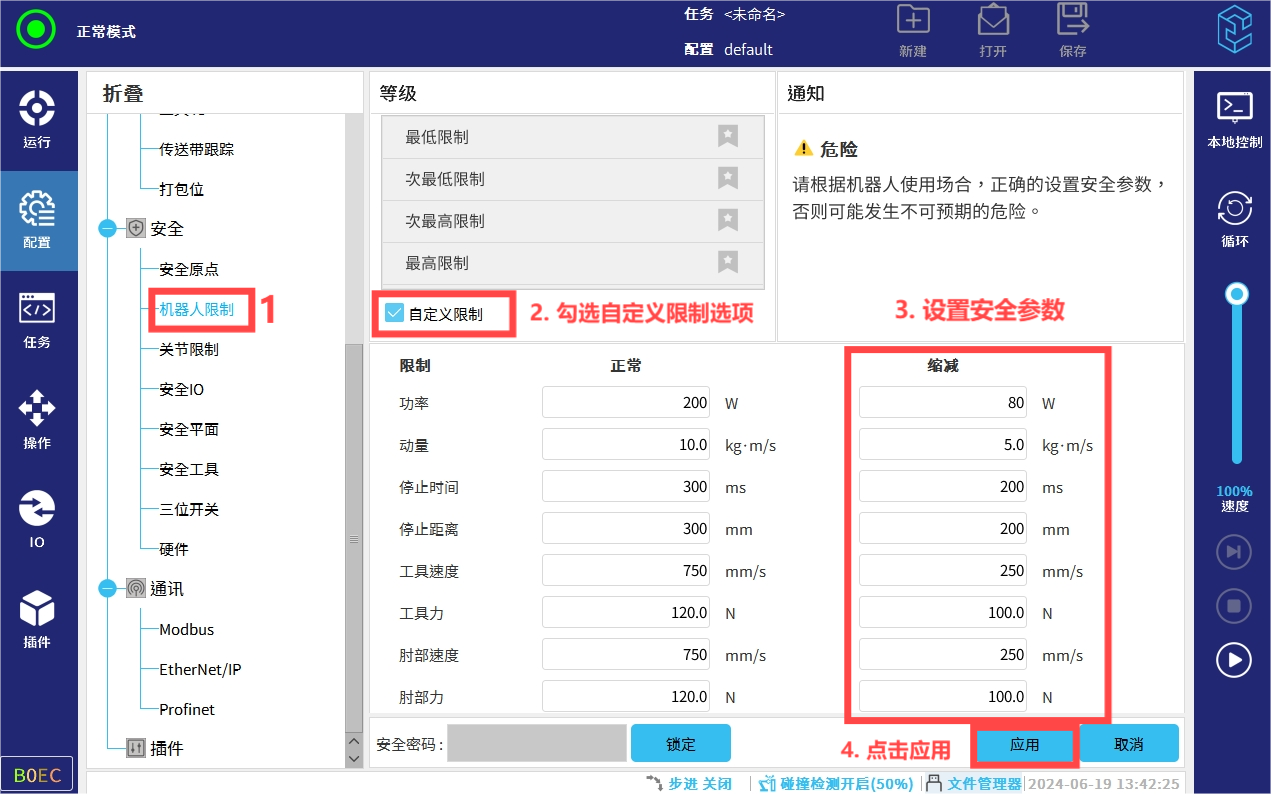 注意:在设置机器人限制参数时,正常模式下的数值要大于缩减模式下的数值。