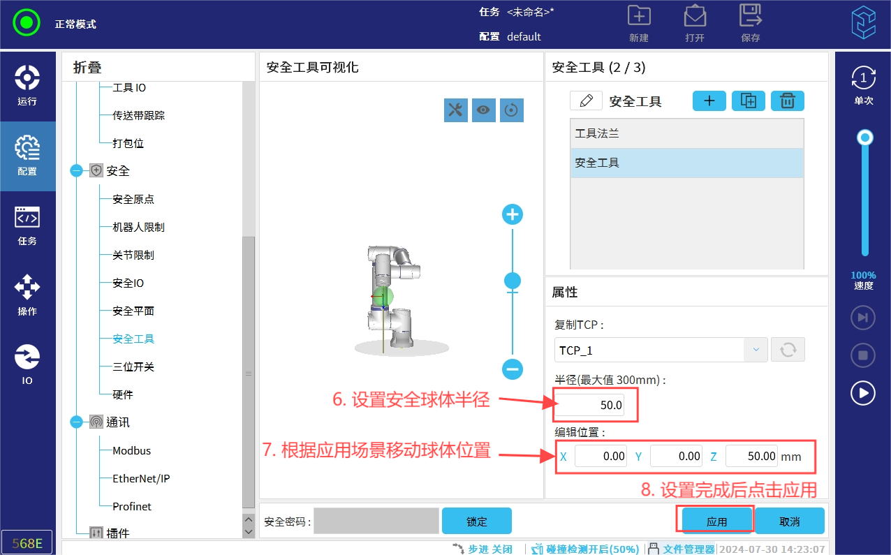 半径的距离是0-300mm之间。设置完成安全工具后一定要点击应用保存。点击应用的时候机械臂会下电,是正常的。