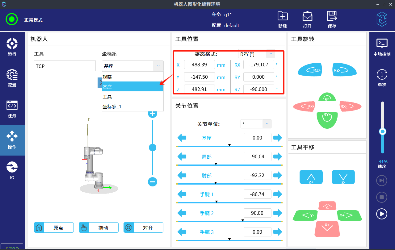 根据位姿变换指令,将base坐标系下的位姿(下方示例中get_actual_tcp_pose())转换成user坐标系(下方示例中坐标系_1)下的位姿(var_1)